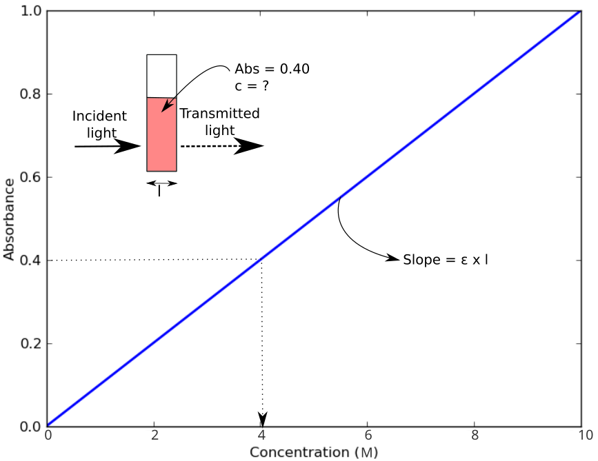 Colorimeters are used to quantify the concentration of an analyte in a sample based on the amount of light of a specific wavelength that is absorbed by the test sample. Absorbance is related to concentration as described by the Beer-Lambert Law. The greater the concentration of a sample, the greater the absorbance value. A light sensor measures the amount of light transmitted through a the sample and calculates absorbance. Comparison of the absorbance measurements to a calibration curve provides the final concentration in the sample. Absorbance (A) of the sample is determined by comparing the intensity of incident light (I0) to the intensity of light after it has passed through the sample (I) using the following equation: