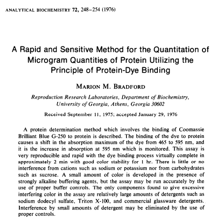 The Bradford protein assay is a very common and widely-used laboratory method for quantifying proteins in solutions. In fact, the original 1976 paper by Marion Bradford is one of the most cited papers in history.