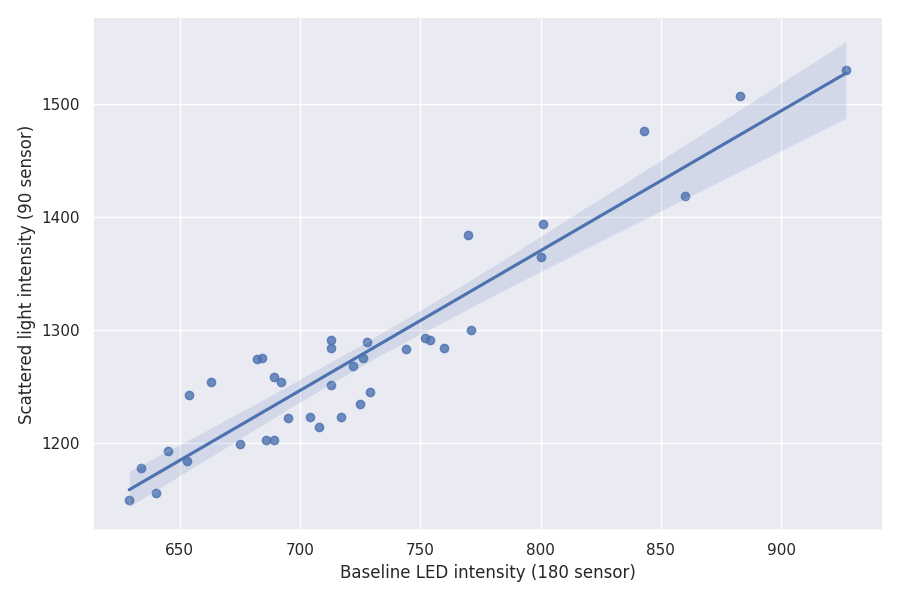 Figure 1 below shows the scattered light intensity measured using the 100 NTU sample (90° light sensor) vs. baseline LED intensity (180° light sensor).
