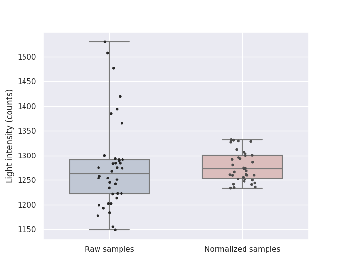 In order to do this we first pick a reference baseline LED light intensity $I_\mathrm{b,ref}$. We then adjust our measured intensity $I_\mathrm{s}$ to the value it would have $I_\mathrm{s,nrm}$ if the baseline LED light intensity was equal to the reference value $I_\mathrm{b,ref}$. This is done as follows