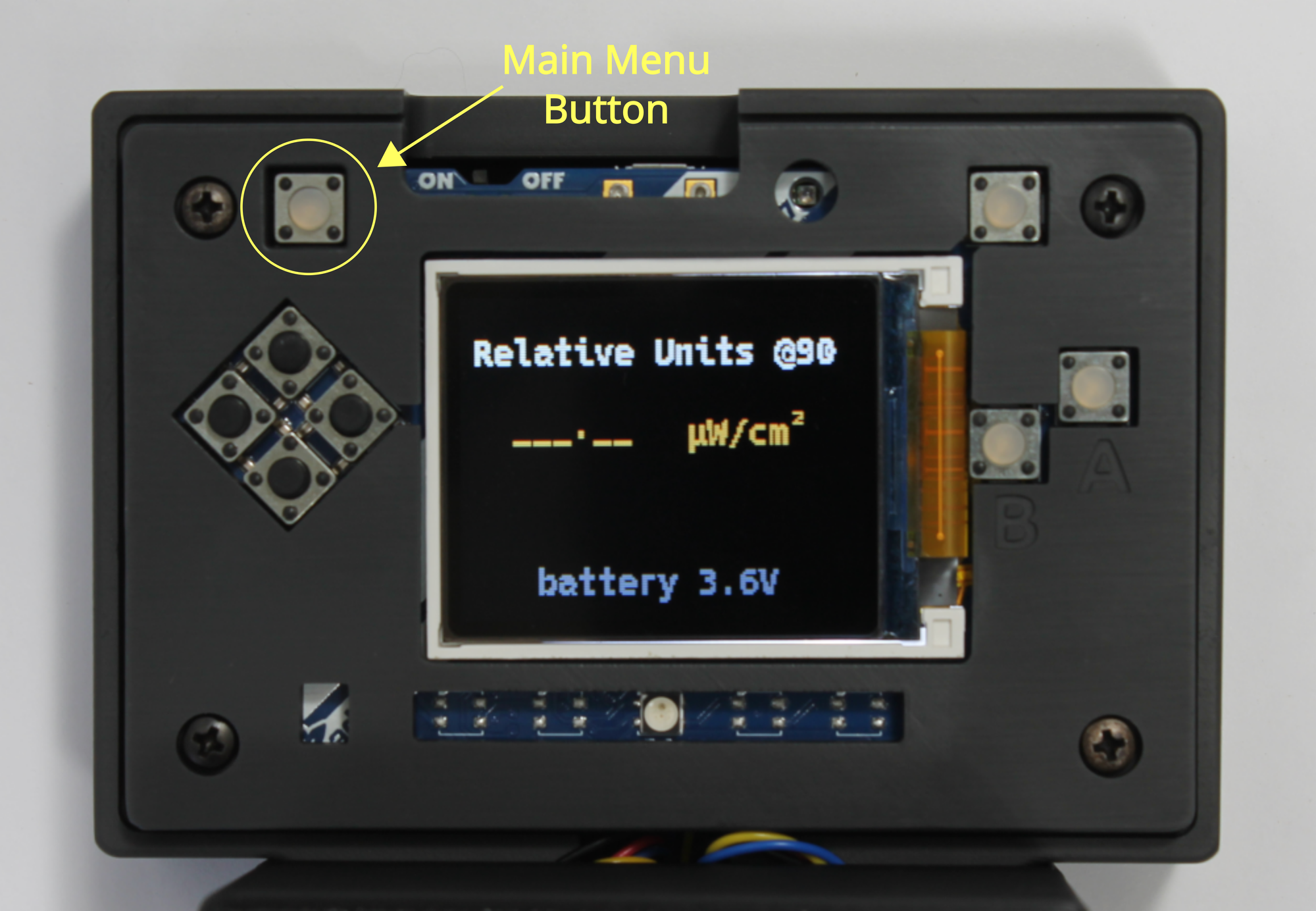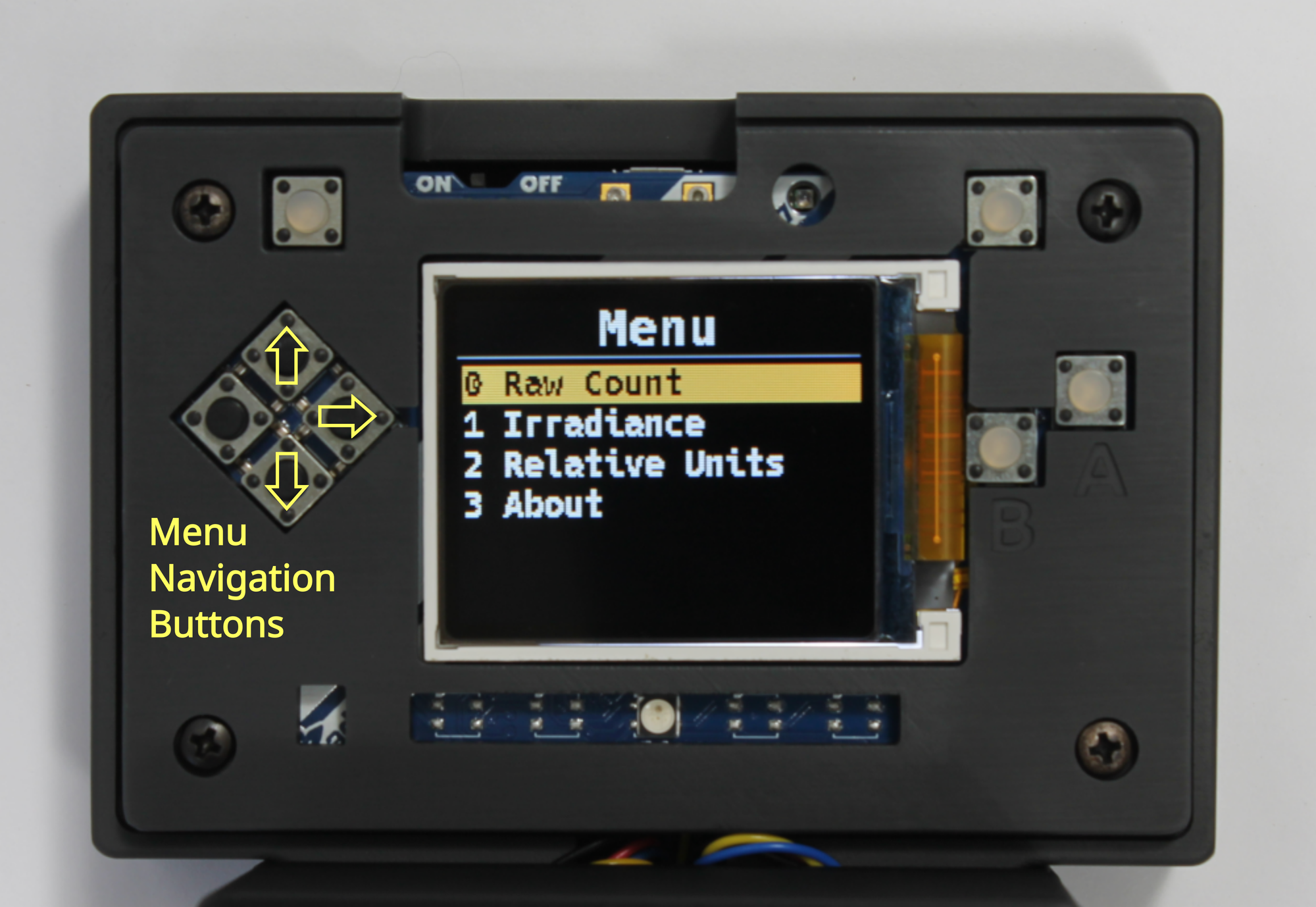 In the Menu you can use the Menu Navigation buttons ⇧⇩ to select the measurement mode you want to use. To select a Mode (e.g. Irradiance) press the right ⇨ button in the cluster.