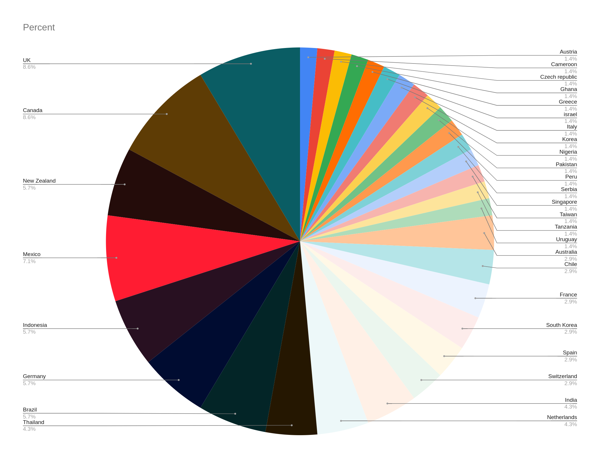 One of the most fun aspects of developing open hardware is learning how and where our designs are being used. For example, we have learned over the years that approximately half of our network (customers + non-customers) are from countries outside the US, where we are based. The pie-chart below represents our international network from 33 different countries in the last 6 months.
