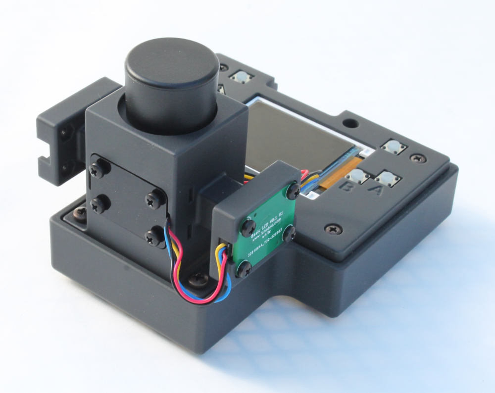 The only hardware change needed to convert the Open Colorimeter to measuring turbidity by light-scattering is to swap out the standard absorbance cuvette holder on the Open Colorimeter with the new R/A version 2 cuvette holder. The same electronics and mounting hardware are used, the only difference is where the sensor is mounted relative to the LED board. The image below shows the final assembled version.