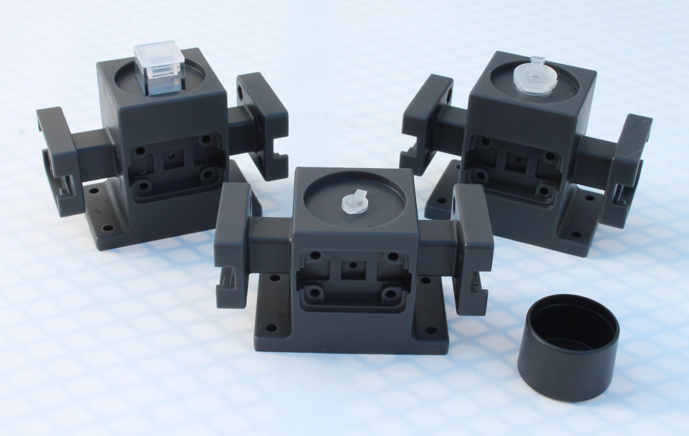3D-printed holders with samples. Left: Cuvette | Middle: 0.5 mL tube | Right: 1.5 mL tube. Light-blocking cap is shown on the far right