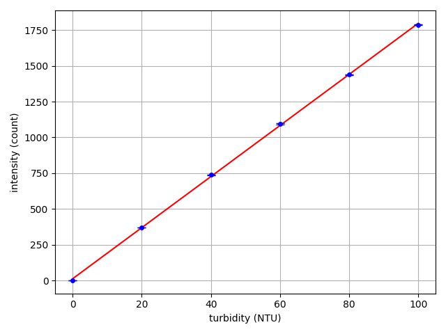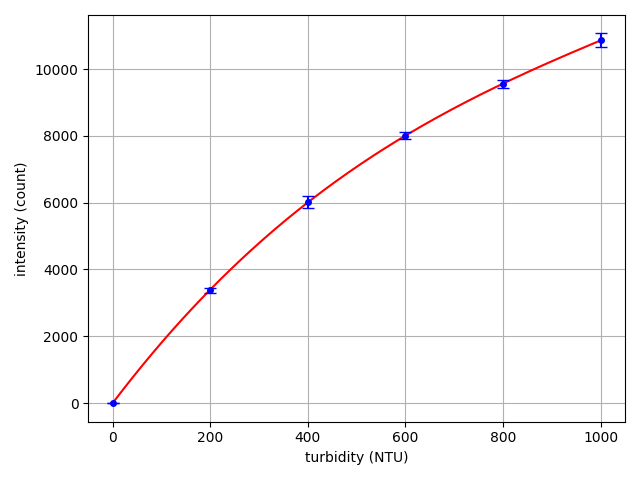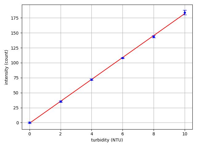 For each sample, we measured light intensity and plotted data versus NTU concentration. Data shown below is the average and standard deviation from 3 separate trials.