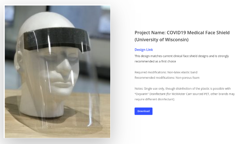 Like many people, we have been alarmed at the reports of the lack of personal protective equipment (PPE) for healthcare workers on the frontlines of the COVID-19 pandemic. We have been following the work of many individuals and groups on social media making open source PPE as we try to determine how we can help. One design we like is a face shield from University of Wisconsin-Madison Makerspace, Delve and Midwest Prototyping described here: https://making.engr.wisc.edu/shield/. The shield is also listed on https://getusppe.org/makers/face-shields/ as a first choice for face shields.