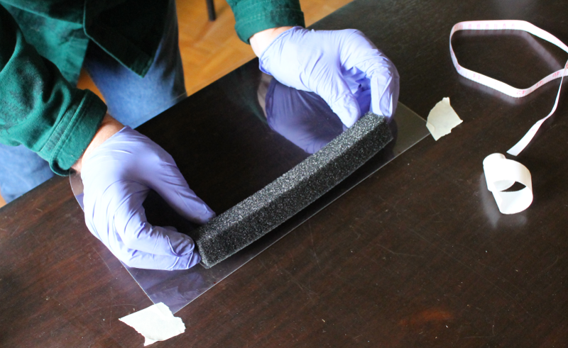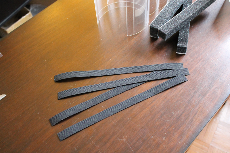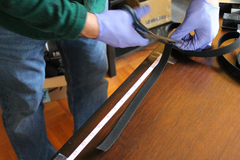 In the original face shield instructions, the elastic headband used is 1" wide. However, this part was on back-order when we looked on McMaster-Carr, so we ended up getting the 0.75" wide elastic band. The instructions say to cut this into 13" long pieces. This is easily carried out using a measuring tape and scissors.