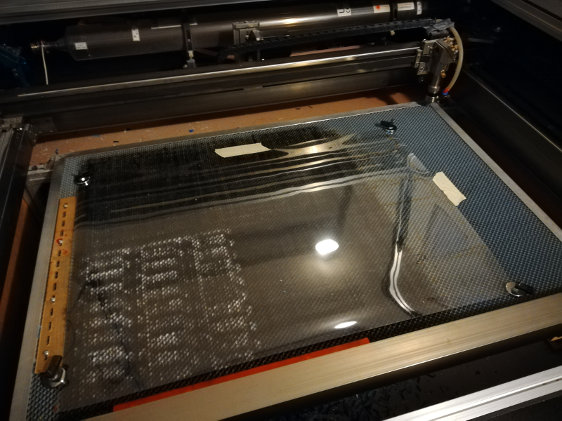 - A sheet was taped onto the bed of the laser cutter and four pieces were laser cut as shown in the images below