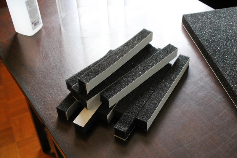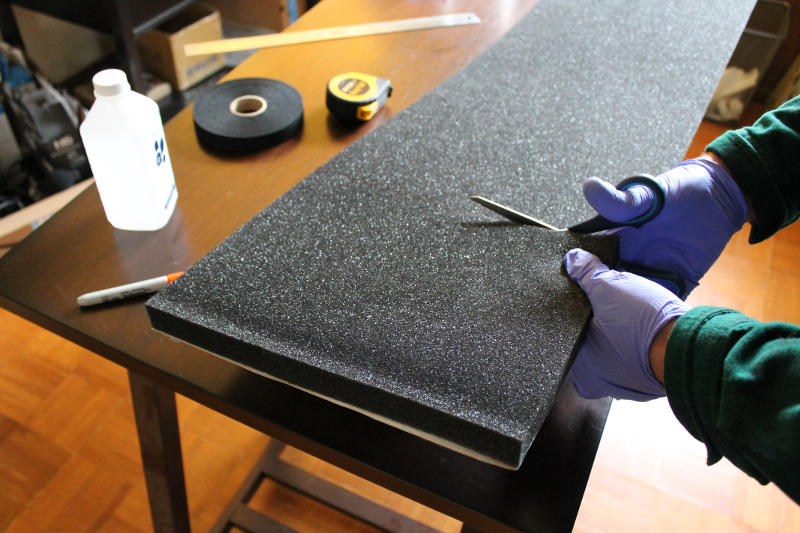 The foam headbands are made from 1" thick adhesive backed polyurethane foam in a 12" x 54" sheet. First we cut an approximately 9" long piece using scissors. Next we used a band-saw to cut this section into 12 x 1" wide strips.