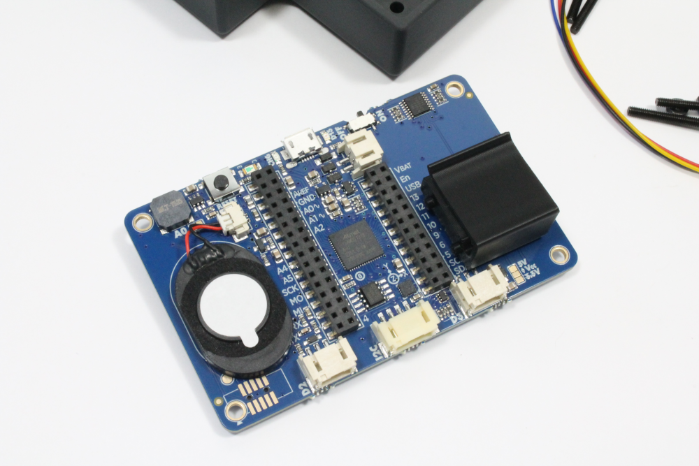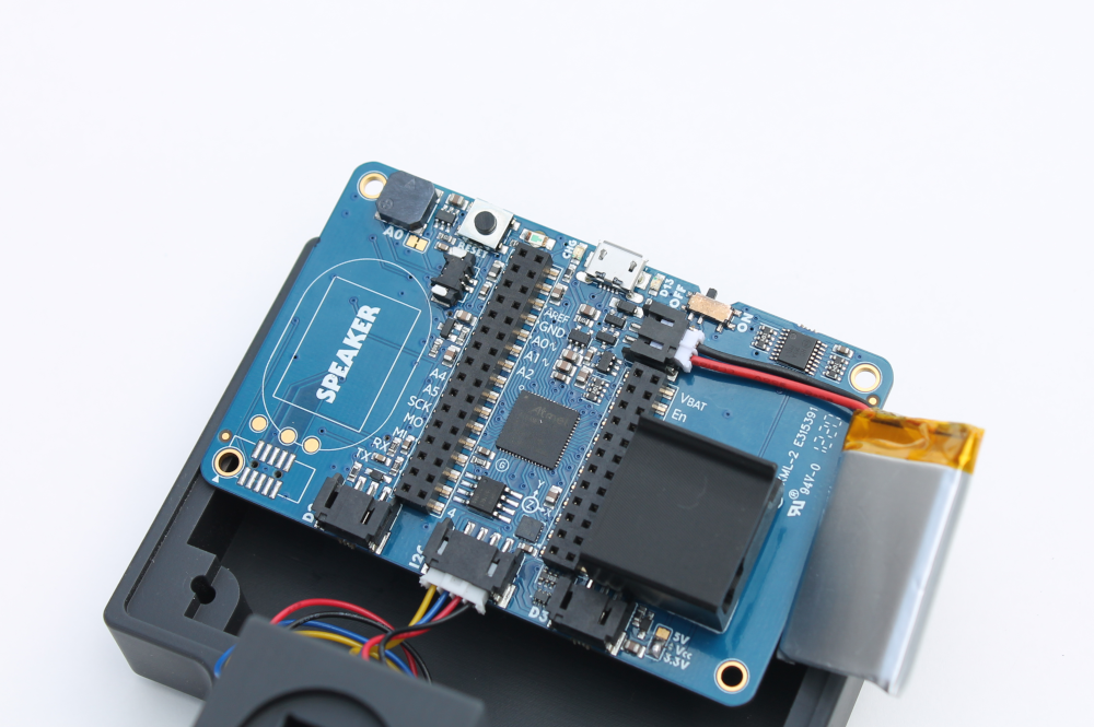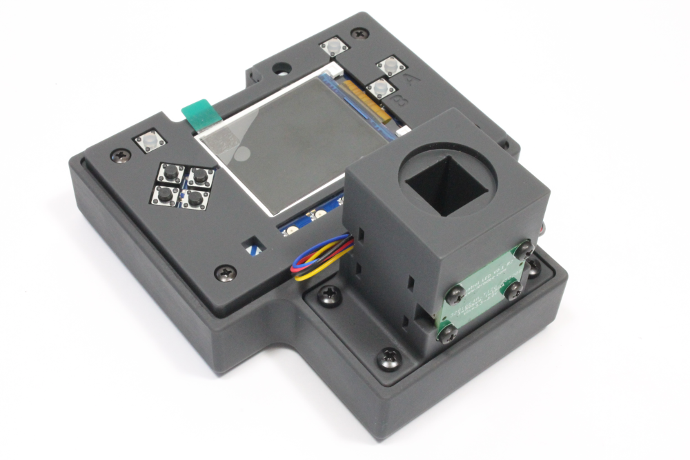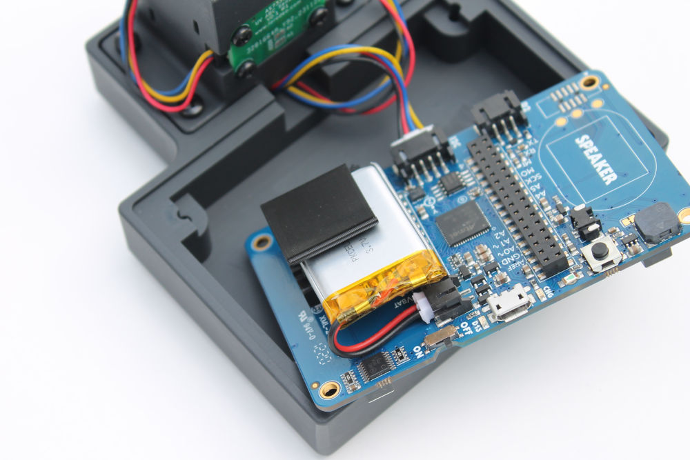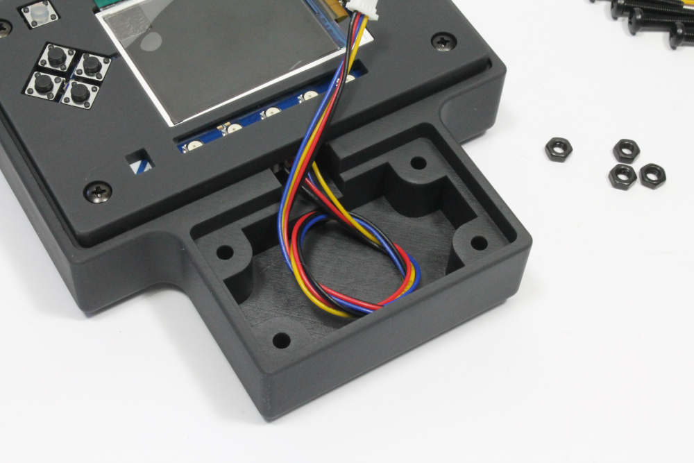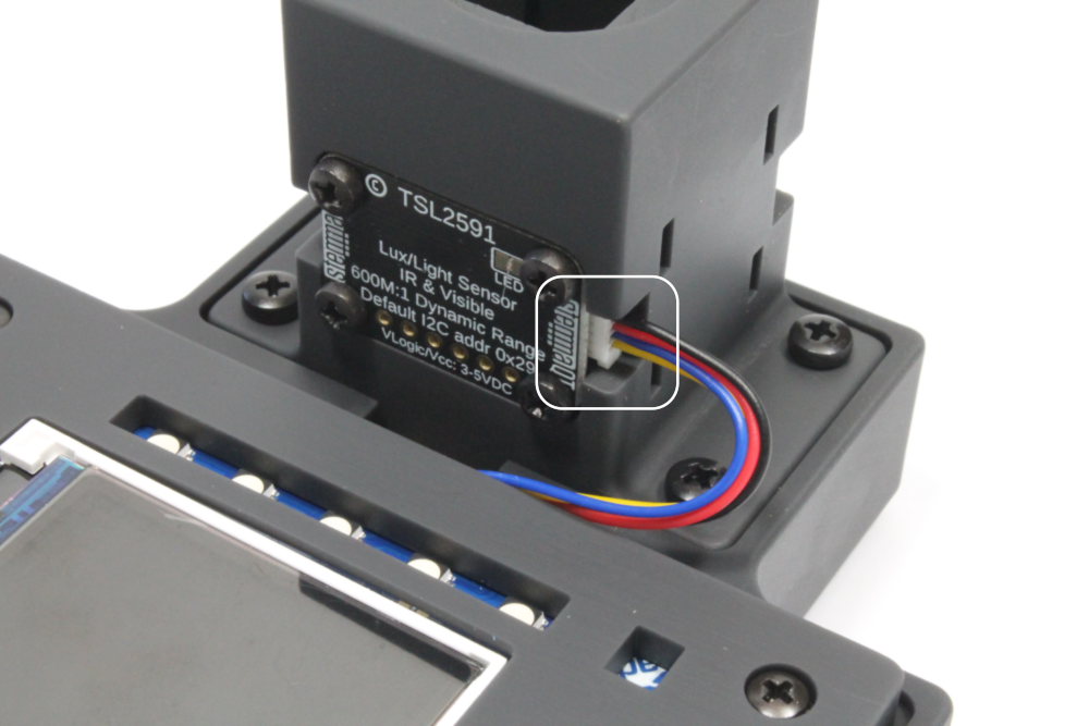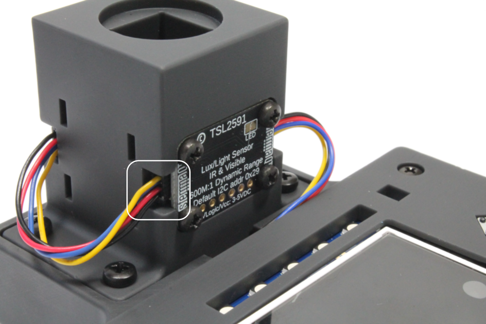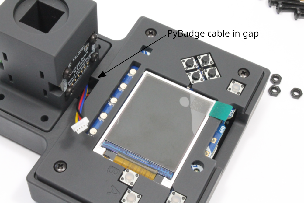 - Next place the cuvette holder onto the enclosure in the orientation shown below with the sensor board facing the PyBadge screen. Also make sure that approx. 1-2 inches of PyBadge cable is sticking out through the gap