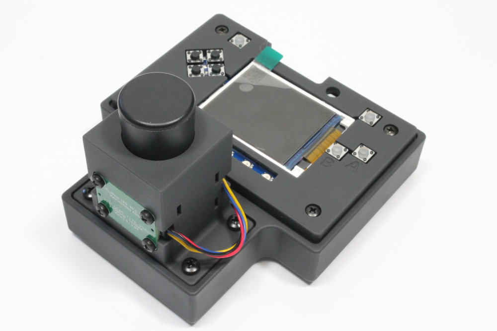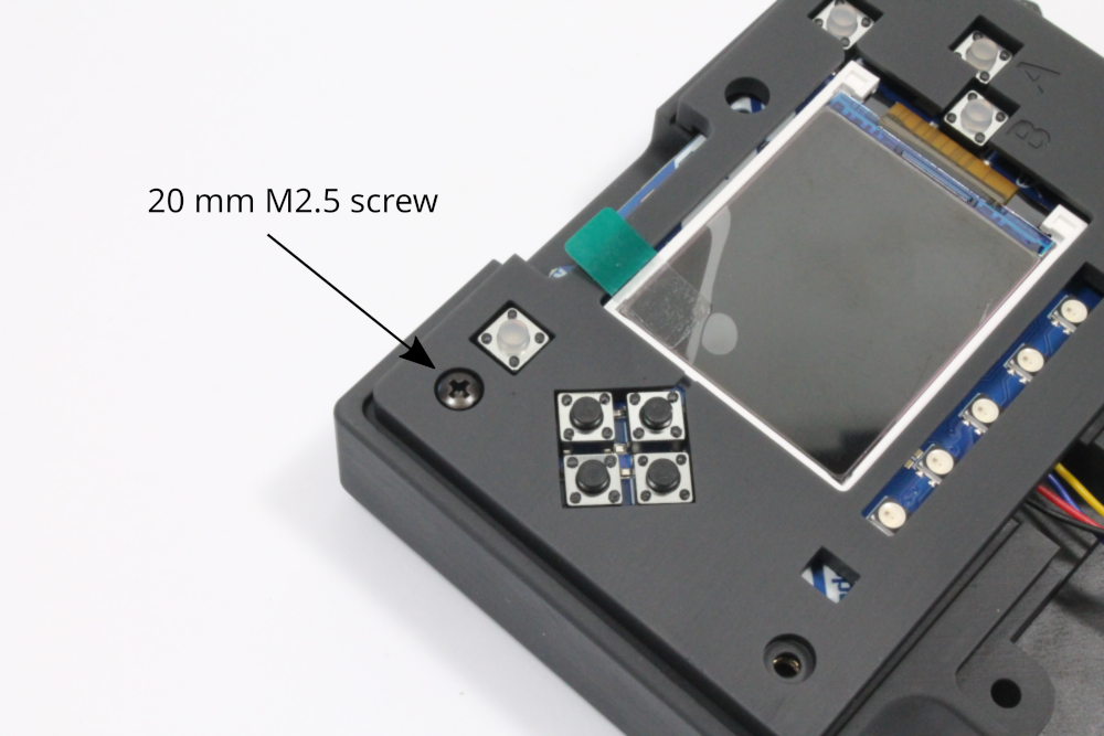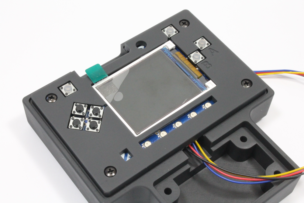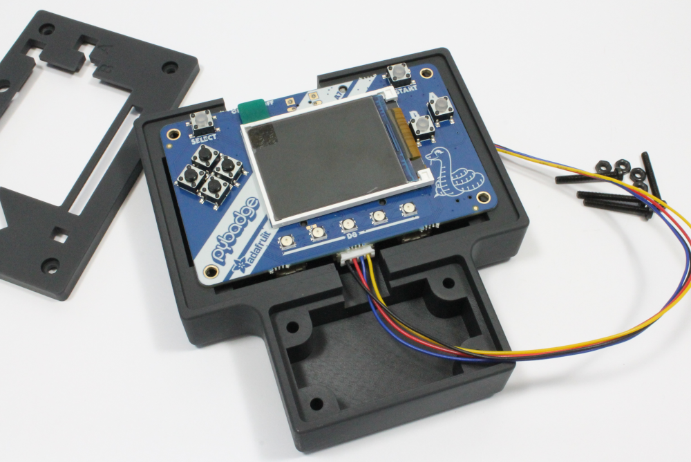 - Place the PyBadge cover over the PyBadge. Place a screw into one of the corner holes and an M2.5 hex nut in the recessed hole on the bottom. Hold the nut in place and use the screwdriver to tighten the screw. Repeat until all 4 corner screws are in place