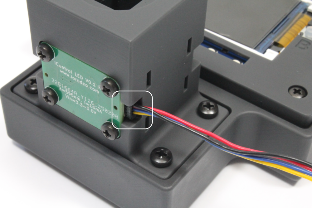 - Connect one end of the 50 mm flexible cable to the right-side connector on the LED board