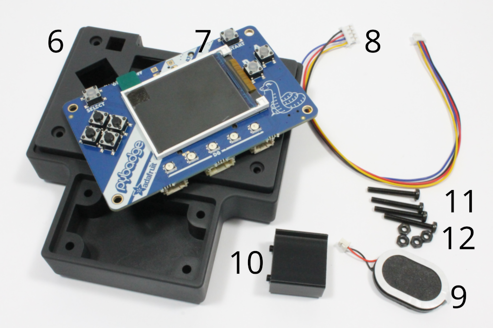 - The first step is to attach the battery holder and mini-speaker to the back of the PyBadge. The PyBadge has two spaces indicating where to mount a battery and/or mini-speaker