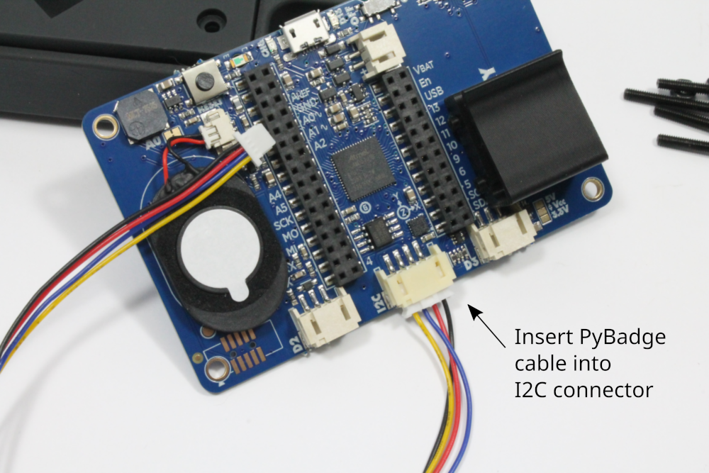 - Insert the large connector on the 200mm PyBadge cable into the I2C connector on the back of the PyBadge