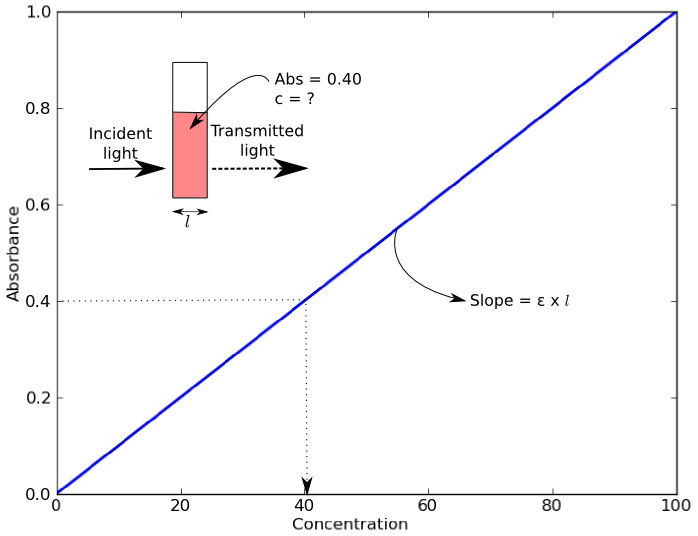 An example of a Beer’s Law plot (concentration versus absorbance) is shown below. The slope of the graph (absorbance over concentration) equals the molar extinction coefficient, εl. As most cuvettes including the ones used in the Open Colorimeter have a 1cm pathlength,( l = 1cm) the slope = molar extinction coefficient.