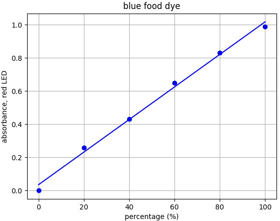 When using a colorimeter to measure absorbance of a colored solution at it's peak absorbance (λmax) value, we should expect a linear relationship between absorbance and concentration. We wanted to verify this with the Open Colorimeter for each of the three LED wavelength options currently available: red (632nm), green (515nm) and blue (460nm). For this test we used the same food dye solutions used in the previous newsletter where we determined peak absorbance for each dye (λmax) using a spectrometer and a modified cuvette holder. In the same newsletter we also measured the peak wavelength (λpeak) for the LEDs used in the Open Colorimeter. With this information we can select the correct LED to use when measuring absorbance i.e. pair an LED with λpeak that most closely matches the samples λmax