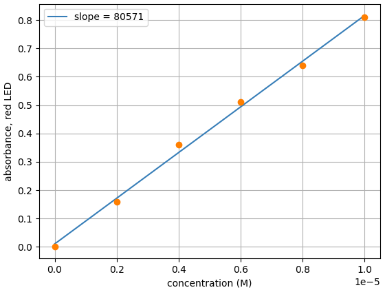 From the slope, we can see the measured molar extinction coefficient for erioglaucine with the Open Colorimeter is 80,571 M-1 cm-1. This is a difference of just 0.7% from the reported value of 80,000 M-1 cm-1.