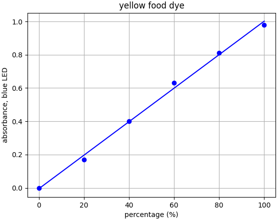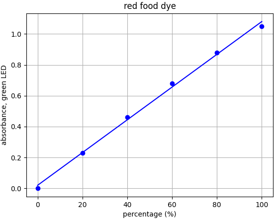 Each food dye was diluted with distilled water to an absorbance of approx. 1.0 at the appropriate wavelength (e.g. red dye measured with green LED). This was labelled the 100% sample. A series of dilutions was made from that 100% stock to prepare samples of 20%, 40%, 60% and 80% food dye. Absorbance was measured using the appropriate LED and results plotted.