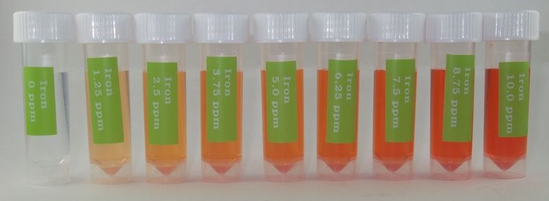 Once you have your colorimetric assay ready, the next step is to collect absorbance data for samples with known concentrations of your analyte of interest. For example, when adding a new colorimetric test for iron, we would use an iron standard (e.g. Iron standard, 200 ppm) to prepare a range of standard solutions. In the image below, we used the FerroVer® Iron Reagent Powder Pillows. This uses the 1,10 phenanthroline colorimetric method for measuring iron. The powder reagents are added to the test solution in a capped tube and shaken. Using the Open Colorimeter and an appropriate LED wavelength board (in this case we used a 470nm LED) absorbance data is generated for a range of 0-10ppm iron.