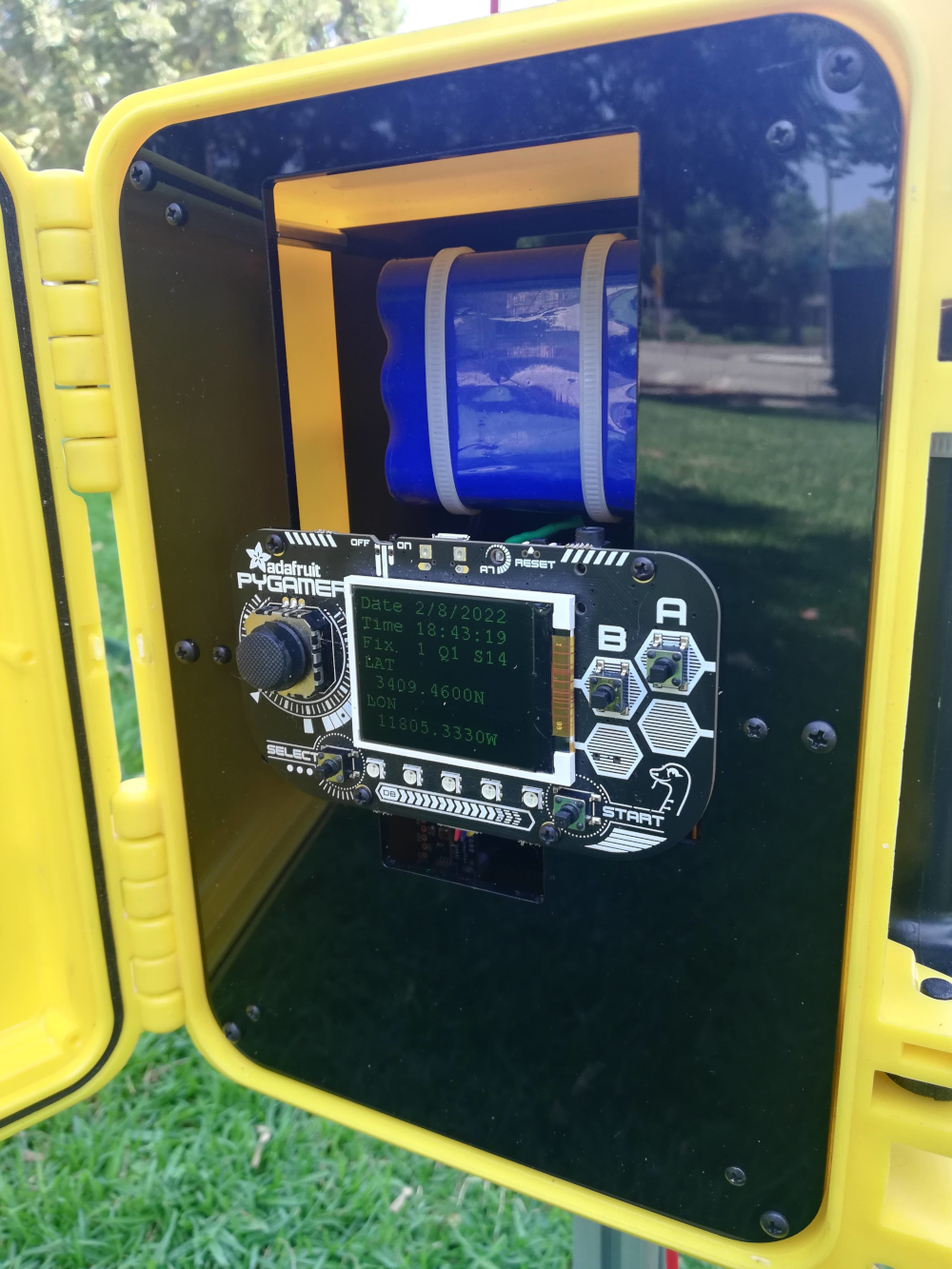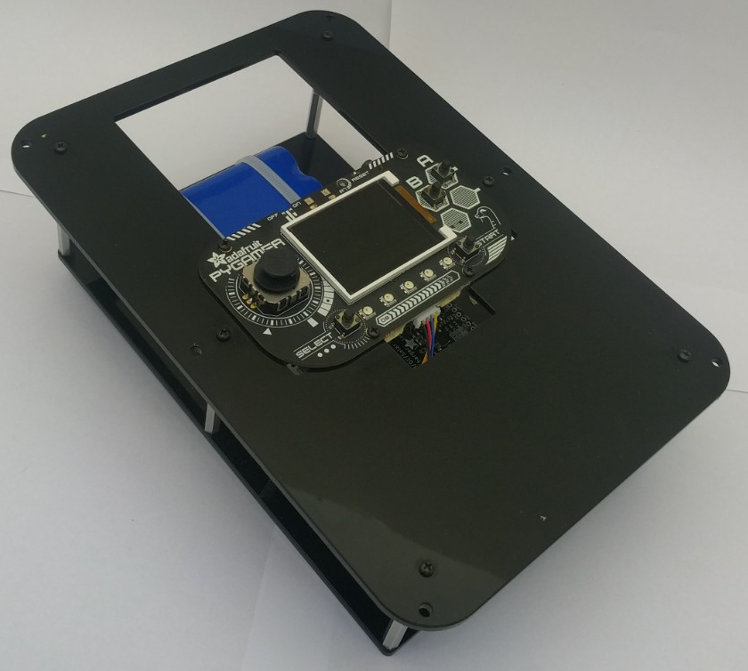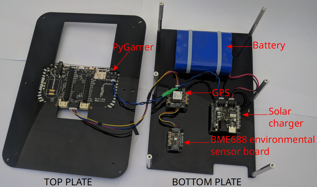 The first step was designing mounting plates for the electronics that will go into the enclosure. We used FreeCAD to make these designs which are on our Github site here. We designed two plates connected by standoffs. The TOP plate has a cutout for mounting the PyGamer and room for inserting/removing the SD card and accessing the on/off switch; the BOTTOM plate has mount holes for the battery, solar charger, GPS and BME688 environmental sensor.
