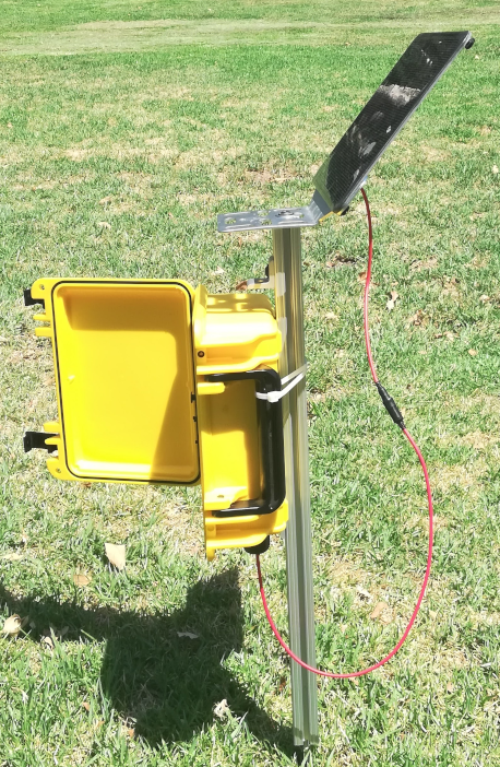 The final assembled version is then inserted into the SE120 enclosure and secured with screws into threaded inserts which we added to the enclosure. Two small holes were drilled in the bottom of the enclosure for gas exchange and for the cable connecting to the solar panel. The enclosure was then mounted onto a piece of extruded aluminum (1010 80/20). A threaded rod was attached for inserting the unit into the ground. The solar panel was attached to the top of the 80/20 with a bracket. See pictures below for the final assembled unit.