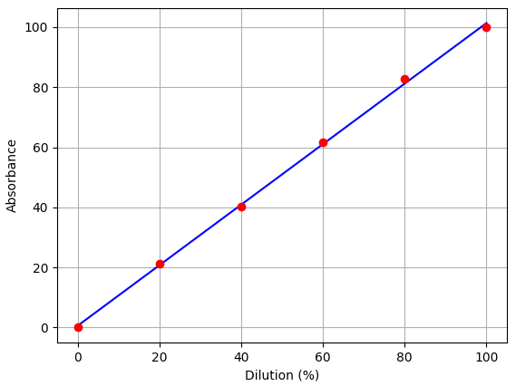 For preliminary testing, we are using food dyes which can be found at most grocery stores. We prepared a serial dilution from 20-100% of yellow food dye, and measured absorbance with the blue 470nm wavelength LED. As expected the plot was linear.