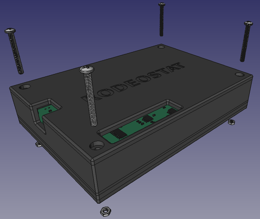 We have been using FreeCAD for 3D hardware designs for a few years now and really enjoy working with it. It is an open-source parametric 3D modeler with a very active and helpful user community. It is multi-platform supporting Windows, Linux and Mac. It has a built-in Python interpreter and is designed from the ground up to be deeply customizable. There are loads of useful community developed external workbenches. In this project we used the KiCad StepUp workbench to import a 3D model of Rodeostat PCB from KiCad and the A2plus Workbench to create an assembly of the complete enclosure including PCB and fasteners. Finally, there are tons of great FreeCAD tutorials online to help you get started and advance your skills.