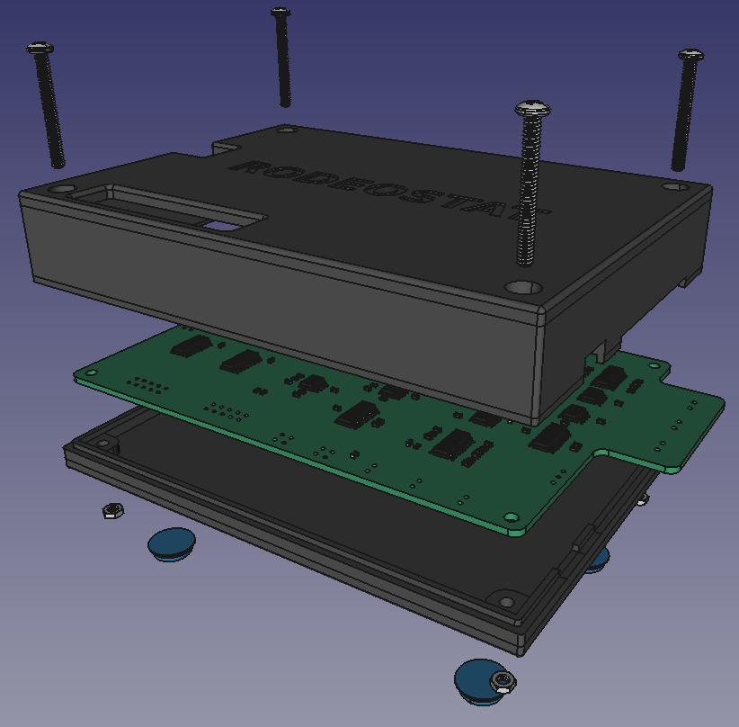 Below is an exploded view of all the components, which we made using the A2Plus workbench. You can see the two parts of the enclosure plus the Rodeostat PCB and hardware (nuts, screws and rubber feet).