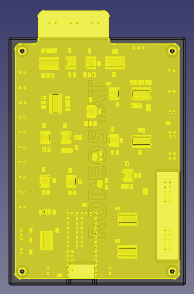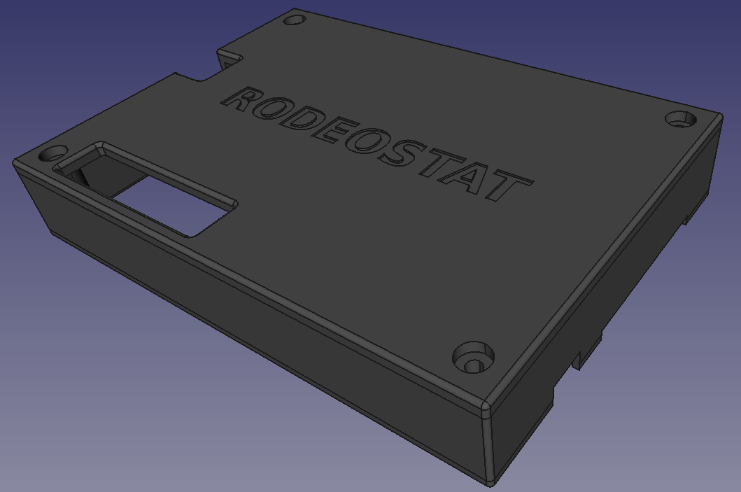The top has the same corresponding corner holes for mounting the PCB with recessed pockets for the screw heads. There are cutouts for the USB connection and expansion cables and we added a "RODEOSTAT" logo.