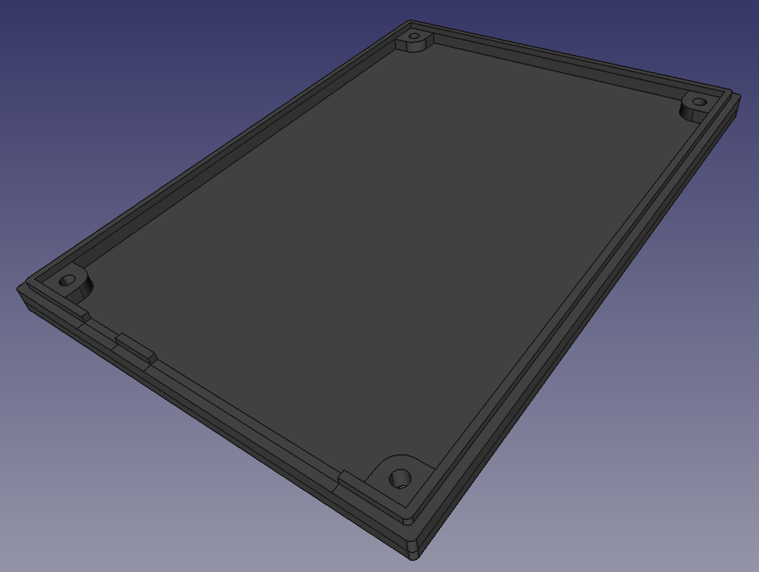 The enclosure consists of two components - a base and top. Shown below is the base. There are holes for mounting the PCB and cutouts for the screw terminals and 3-pin header. On the underside of the base corresponding to each screw holes is a hexagonal pocket for placing a nut (not shown).