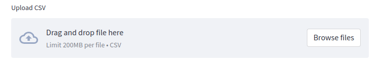 To upload your data into the app you can simply drag and drop the file to the file uploader widget on the app or use the Browse Files button on the widget to open a file selection dialog. An image of the file uploader widget is shown below.