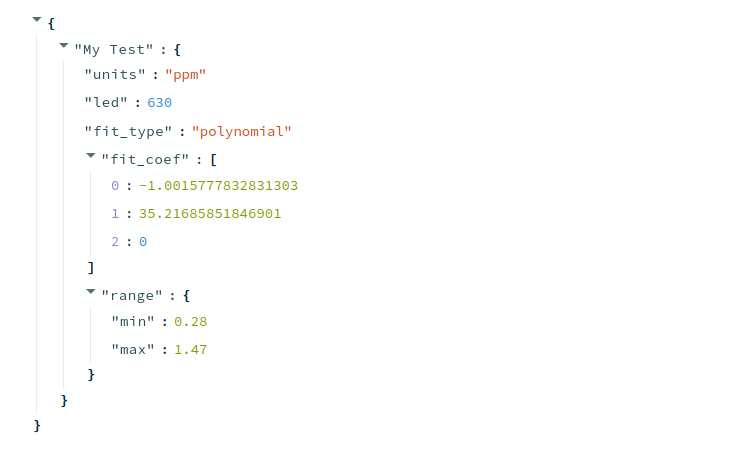 In addition the .json "calibration object" for your colorimeter will be shown below the plot on the app window. It will look similar to the example below.
