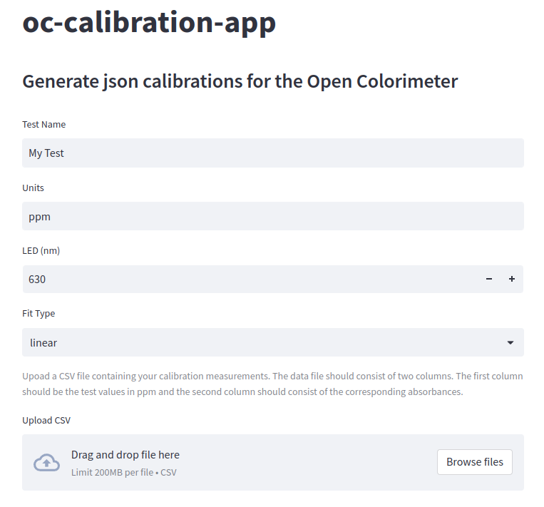 In this set of notes we describe how to generate custom calibrations for the Open Colorimeter using a simple web app called the oc-calibration-app. This app makes fitting your calibration data and generating the required .json file for your colorimeter quick and easy. The app is developed using the Streamlit framework and it can be accessed and run from the Streamlit Community Cloud or installed locally on your own computer.