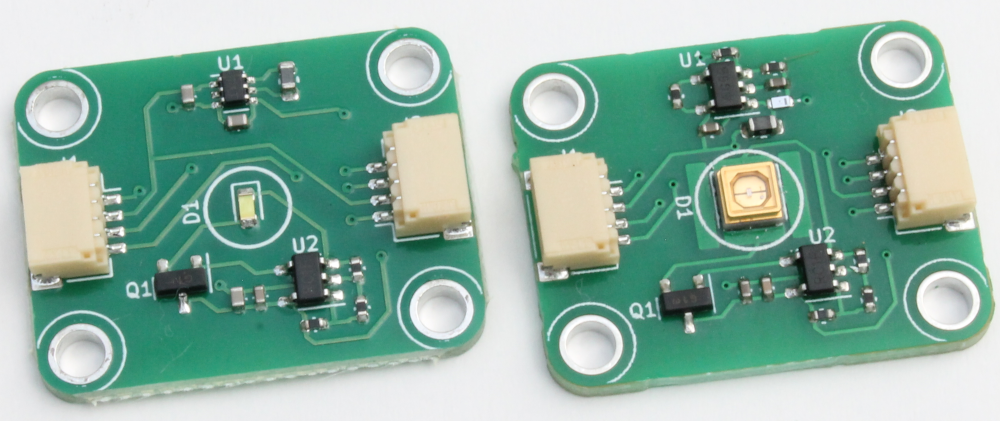 We have developed a range of UV, visible and IR LED single-wavelength boards which can be used with the Open Colorimeter instruments. The LED boards include an on-board voltage regulator which enables operation from 3.3V to 5V input voltage. An active 16mA (or 24mA) constant current LED driver maintains stable LED current.