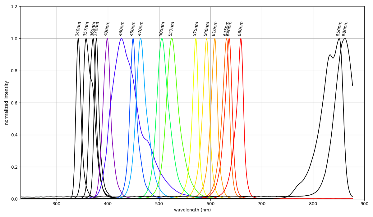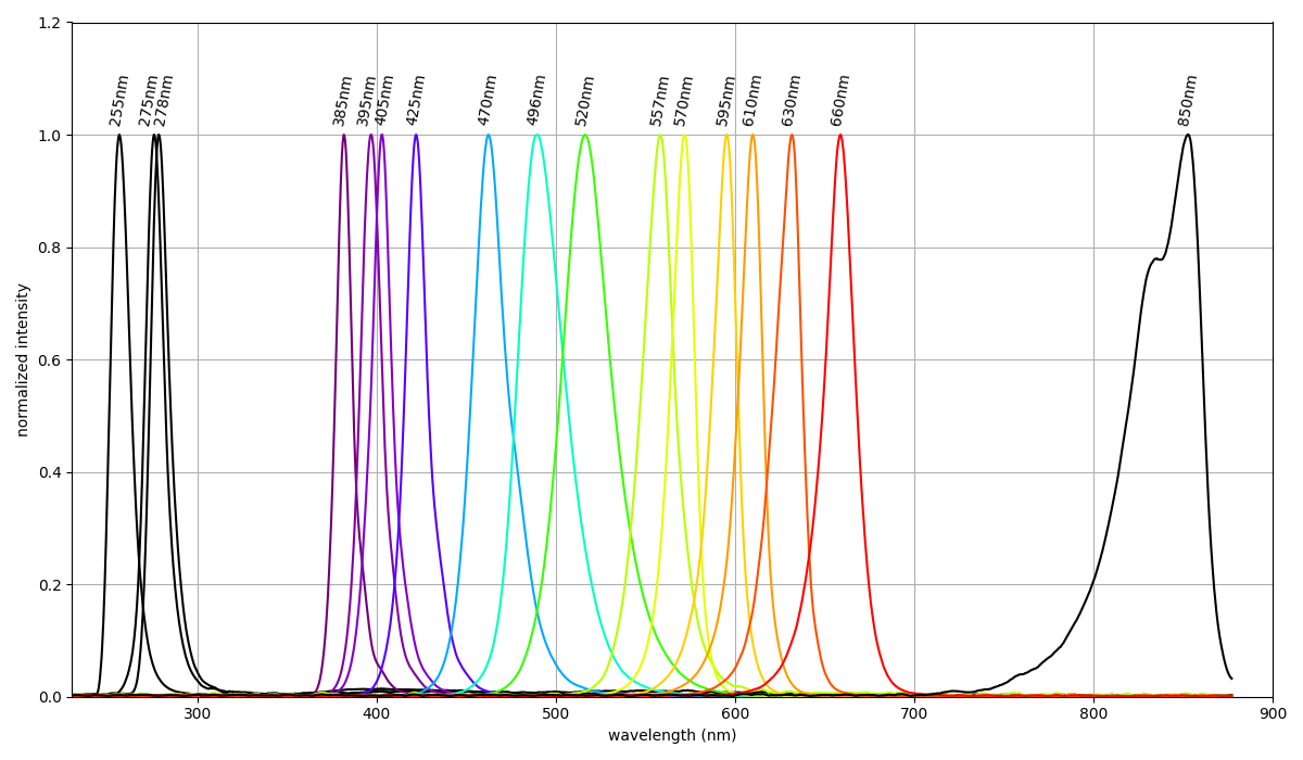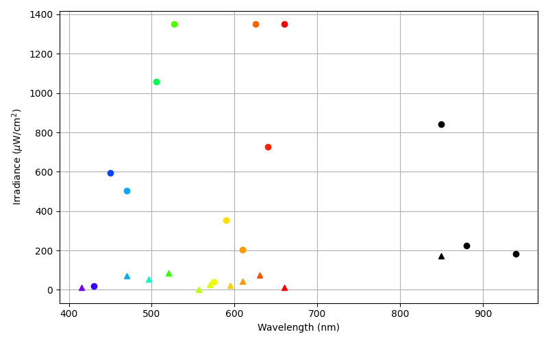 We collect spectral data for each LED board using an Ocean Optics spectophotometer. Irradiance data is also collected using the irradiance measurement option in the Open Colorimeter firmware. For convenience all of this information is available in the gallery linked below. In addition to measured data, you can also find more LED specifications from the manufacturer and links to datasheets.