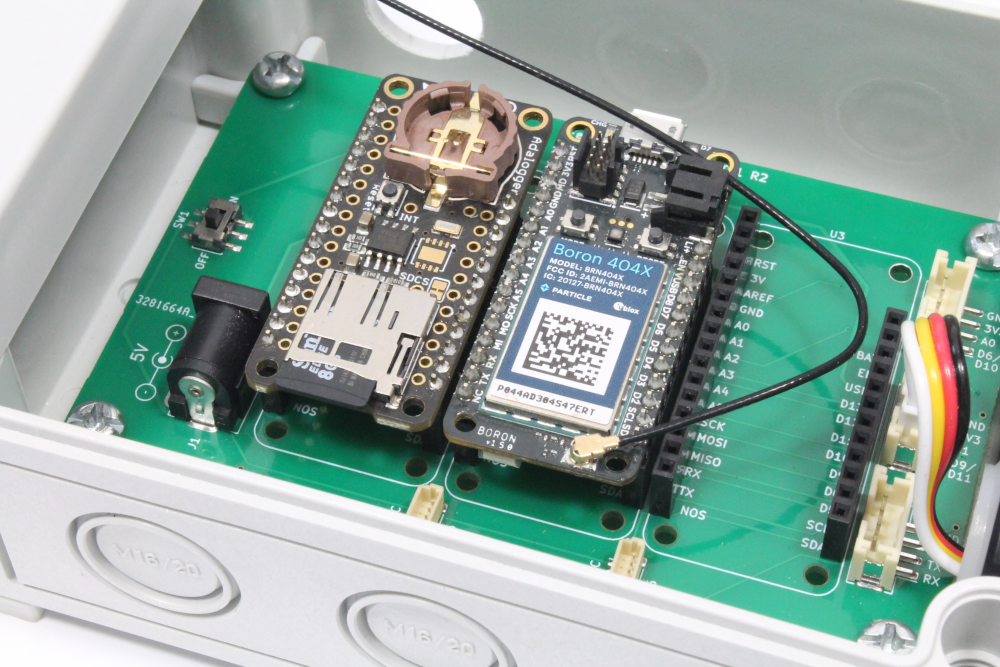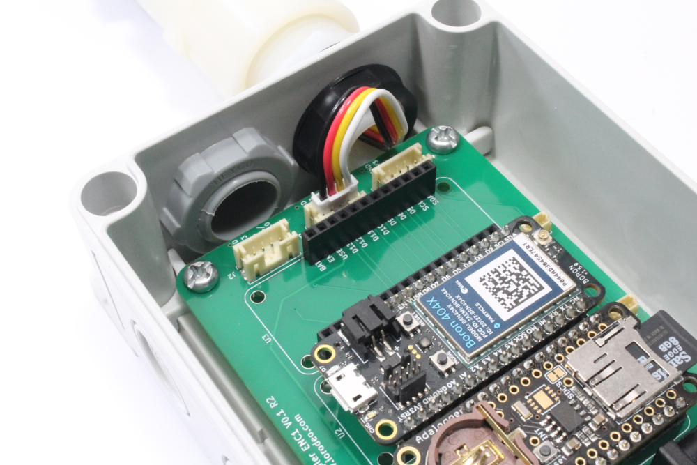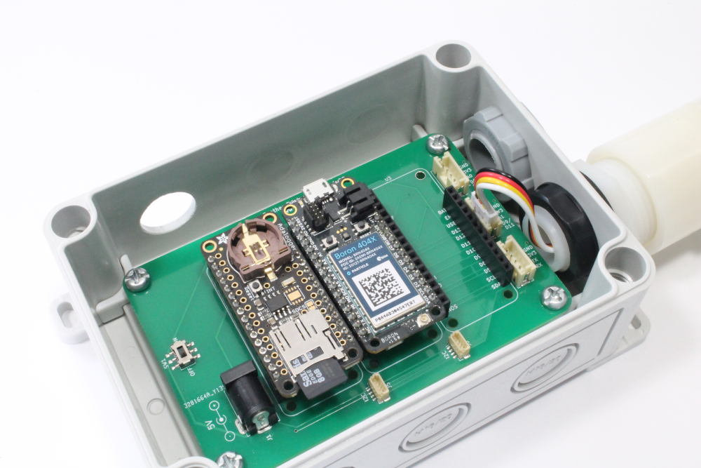 ii) Connect the cable from the MaxSonar to the middle JST PH 4-pin connector (J3). Use the image below to verify the cable is inserted in the correct orientation. Next, insert the micro SD card into the SD card socket on the Adalogger and insert both the Adalogger FeatherWing and Boron onto the PCB.
