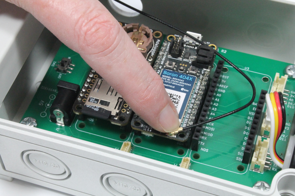 iv) Push the the antenna cable connector into the corresponding header on the Boron to connect the antenna.