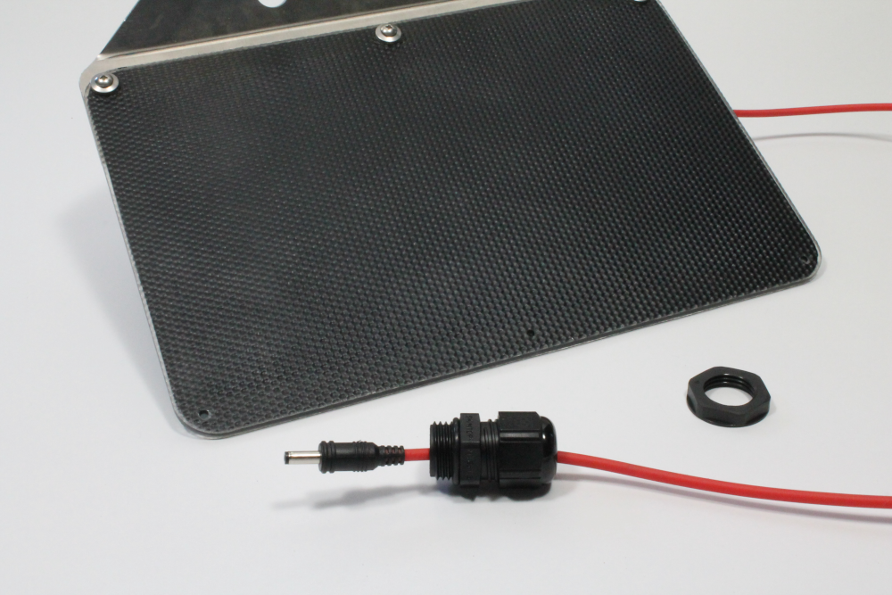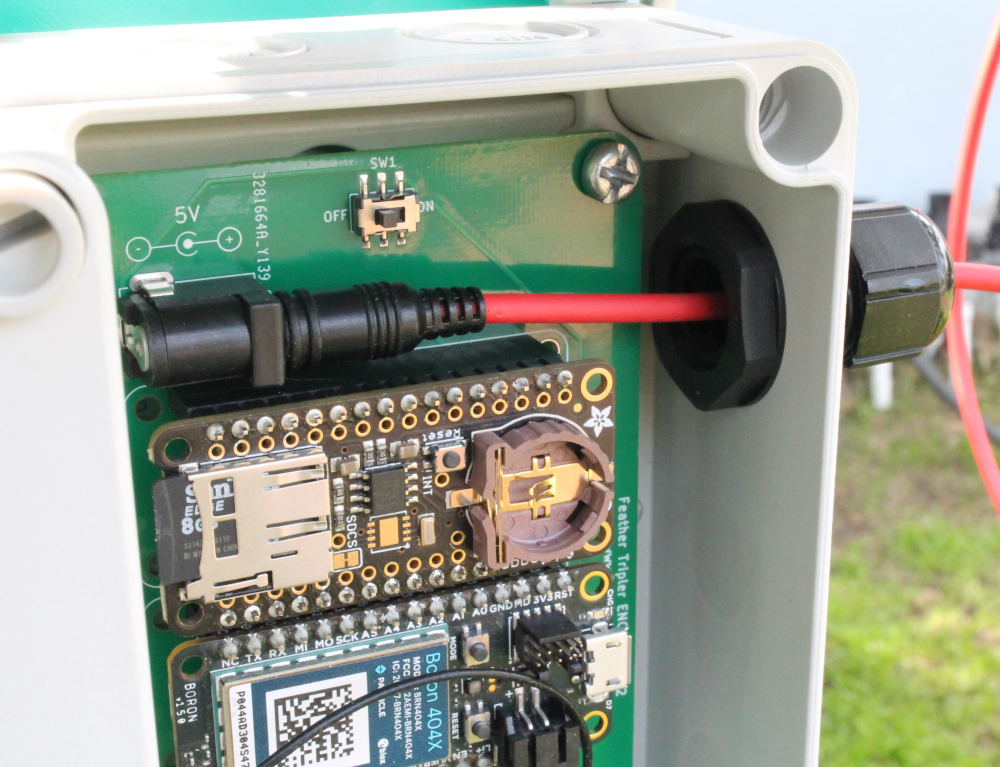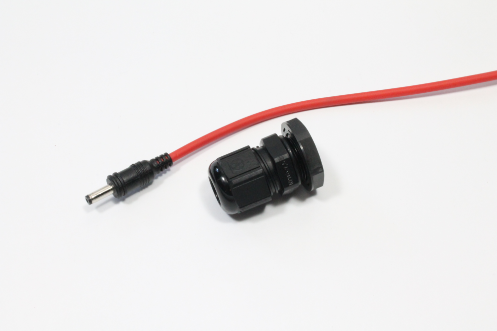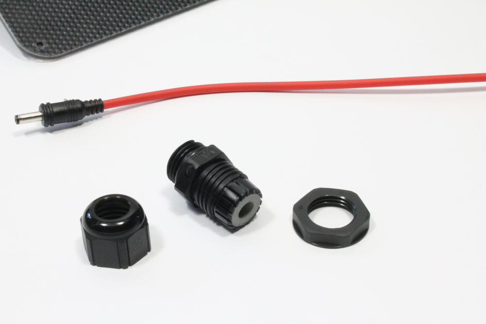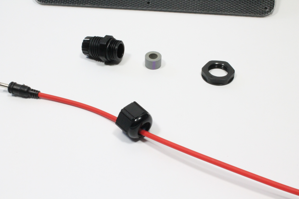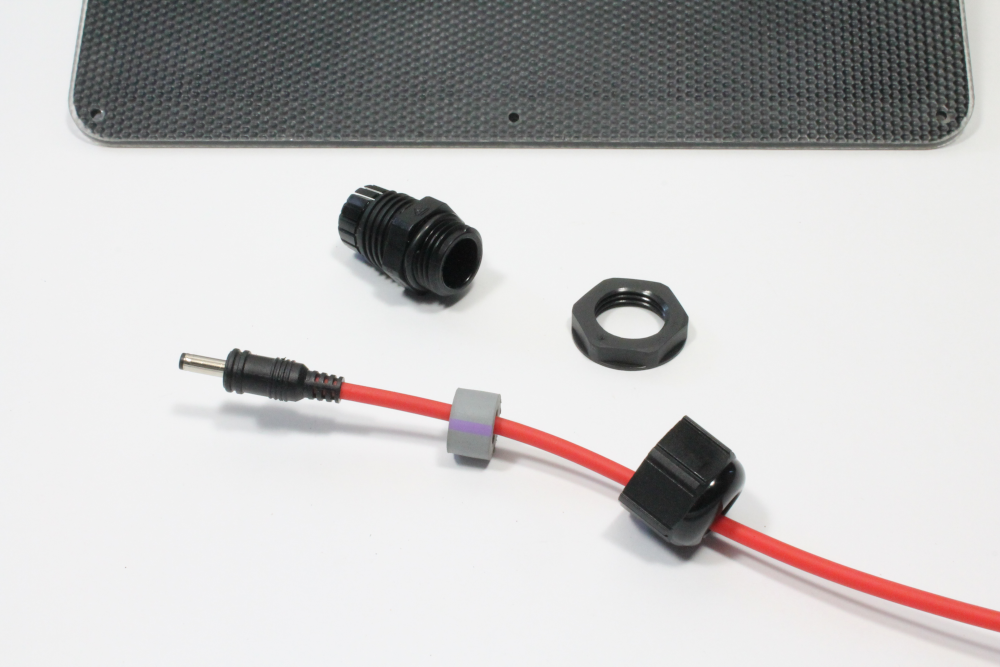 ii) Place the lock-nut from the previous step 5 into the enclosure and pass the end of the power supply cable through the enclosure knockout and lock-nut into the DC jack plug on the Feather Tripler. Once you have the power cable situated, tighten down the lock-nut inside the enclosure and the waterproof cable entry on the other side. The cable should be tightly gripped in place.
