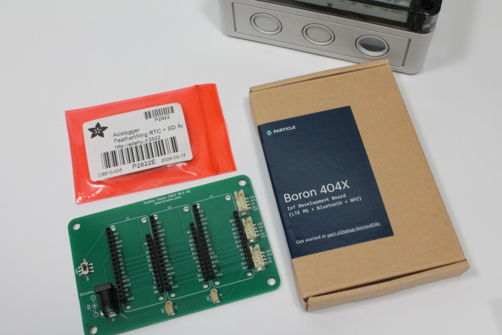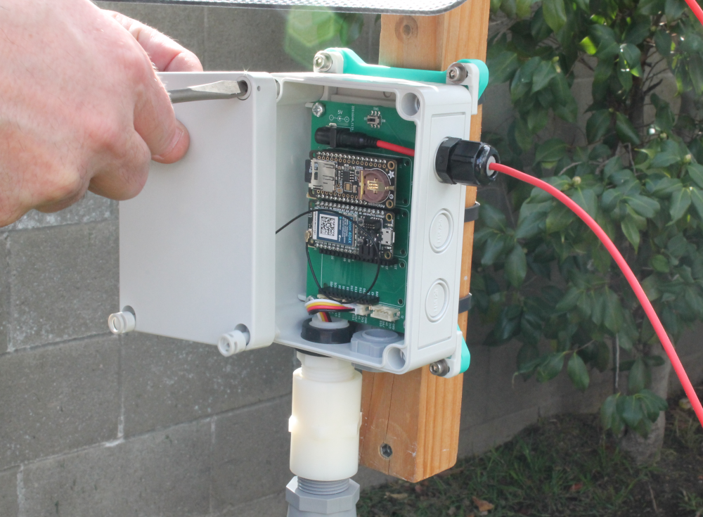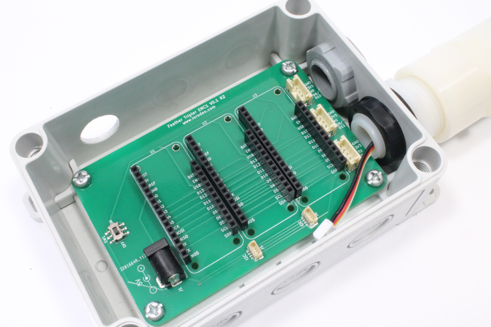 i) Mount the Feather Tripler PCB into the enclosure using the 4 mounting screws. Tighten down with the screwdriver to secure in place