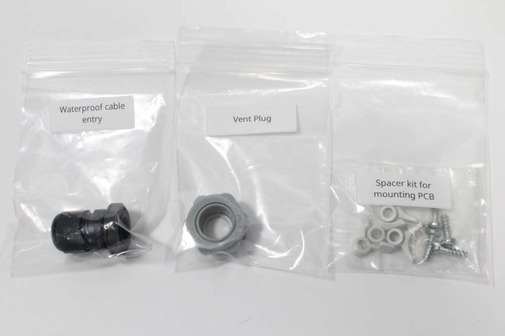 ii) Insert the 4 PCB mounting parts into the corners of the enclosure. Press them firmly into place, one in each corner.