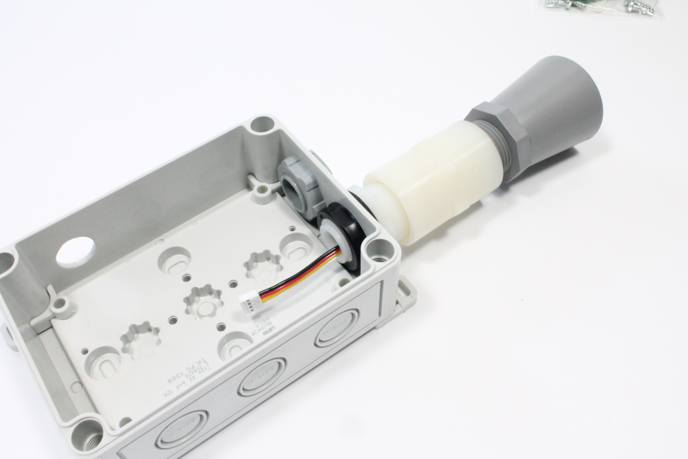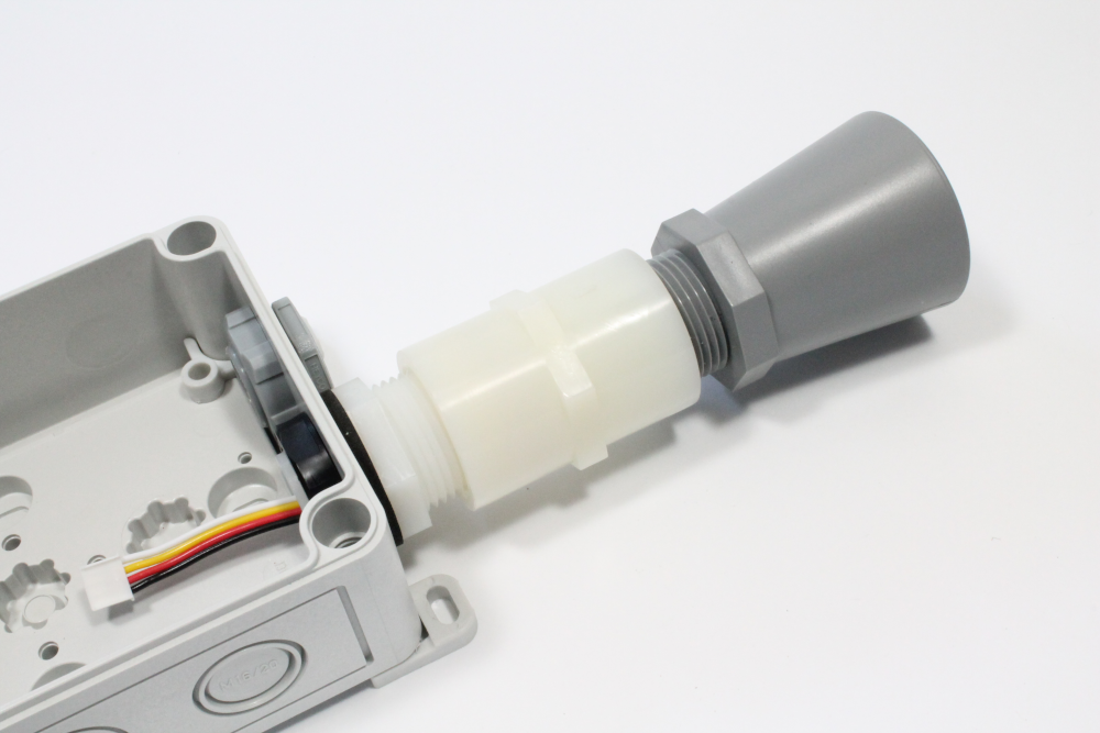 v) Fit the assembled sensor into the enclosure placing the black locknut inside the enclosure to secure the sensor in place.