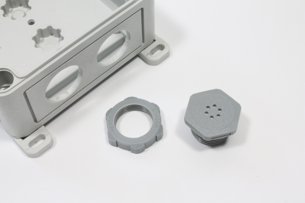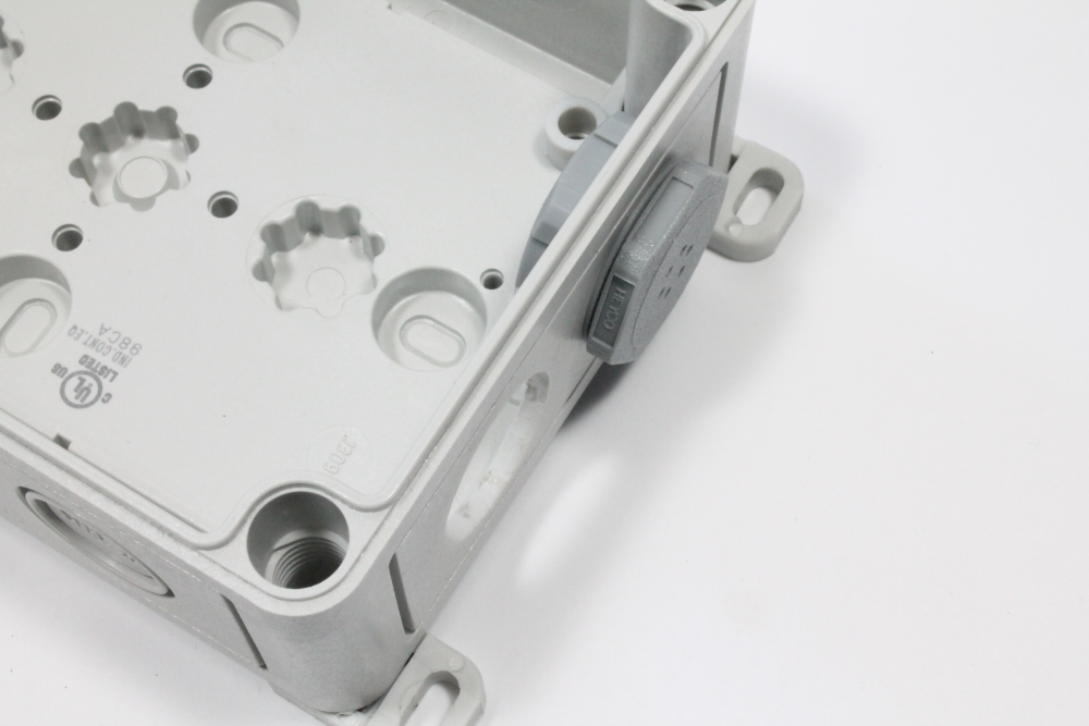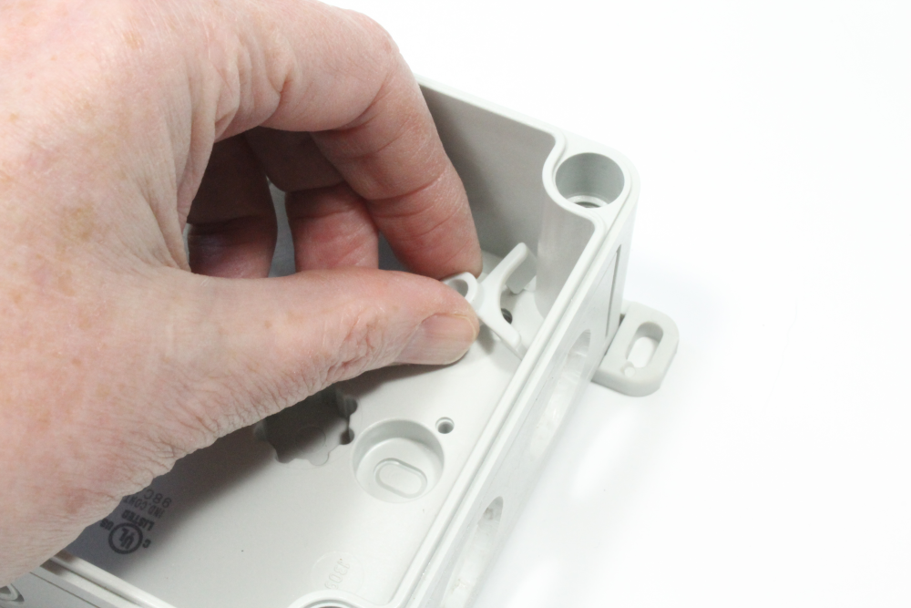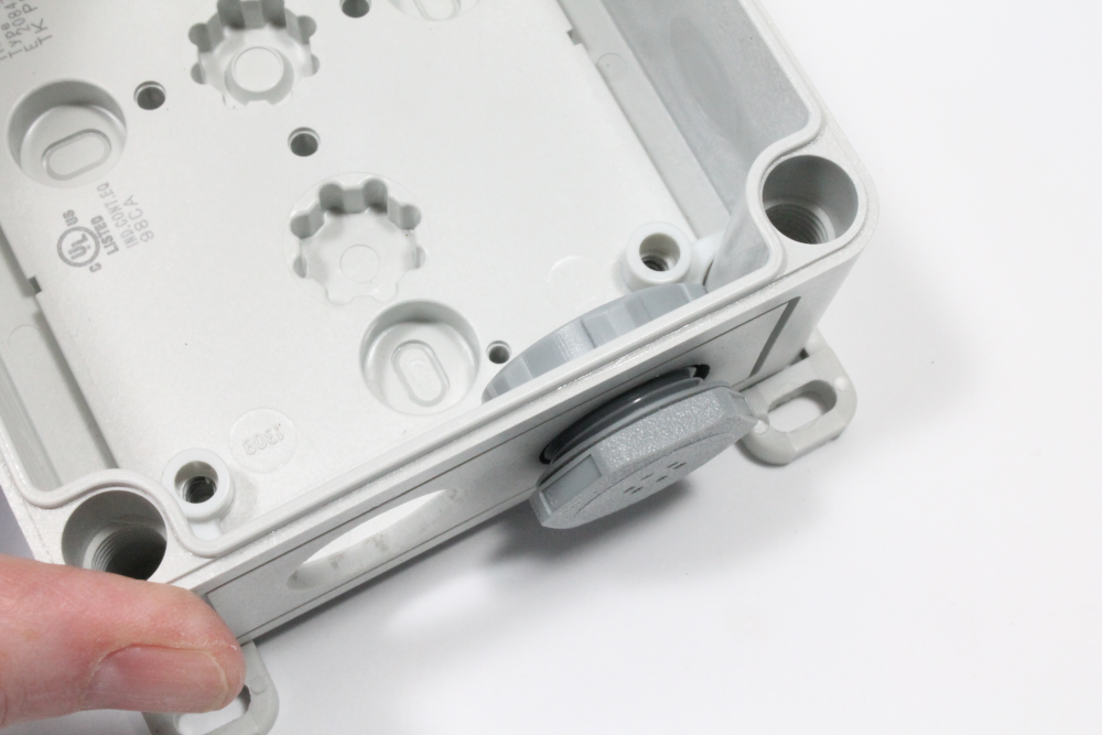 iii) Unscrew to separate the two parts of the vent plug. Place the vent part into the bottom right knockout with the plastic ring inside the enclosure. Screw the parts back together again so that the vent plug is facing out of the enclosure as shown in the images below.