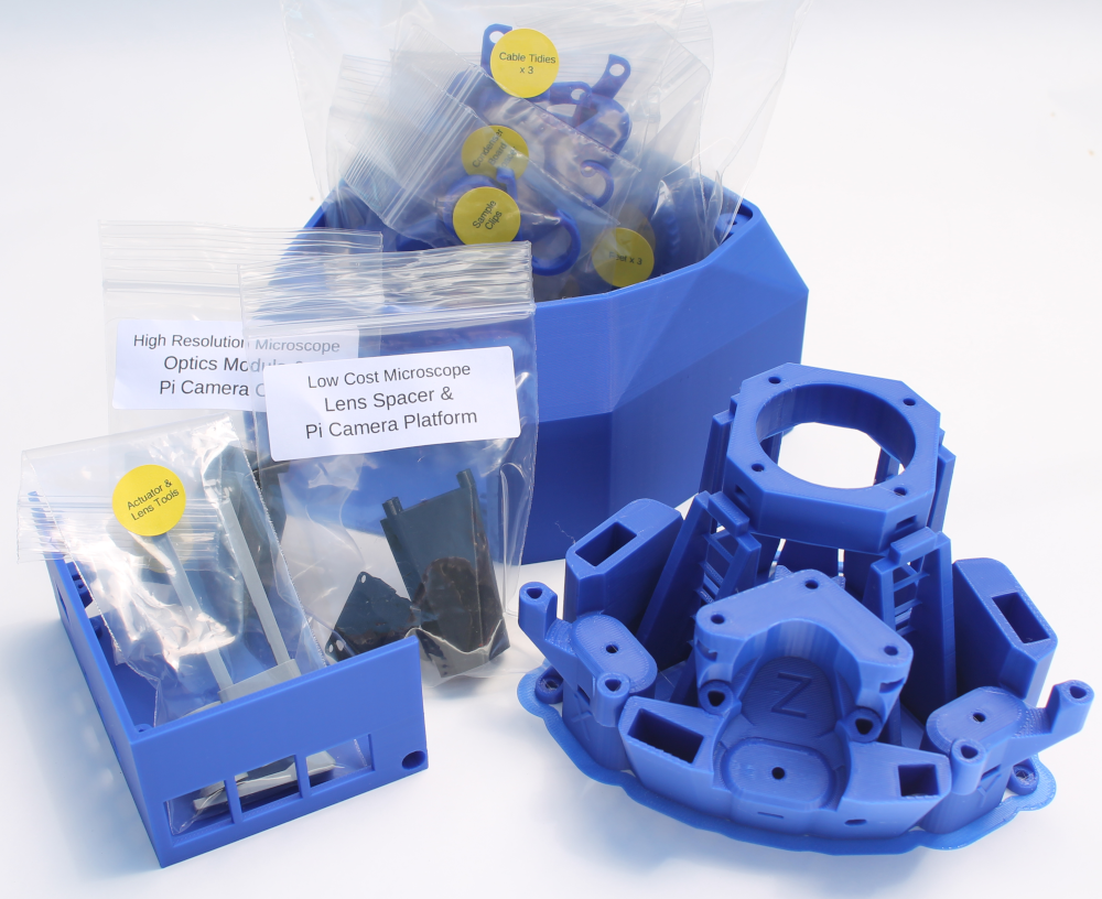 This page lists all of the parts in the OpenFlexure Microscope kit. This kit is used to build either the Low-Cost version or High-Resolution version of the OpenFlexure v7 Microscope. Parts in this kit are sourced using the official OpenFlexure Bill of Materials as a guide.