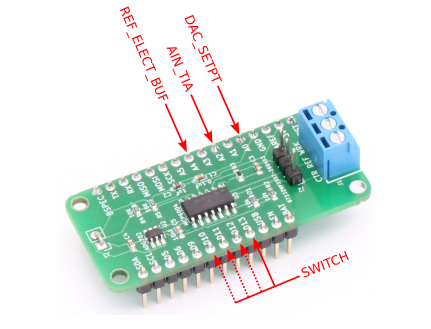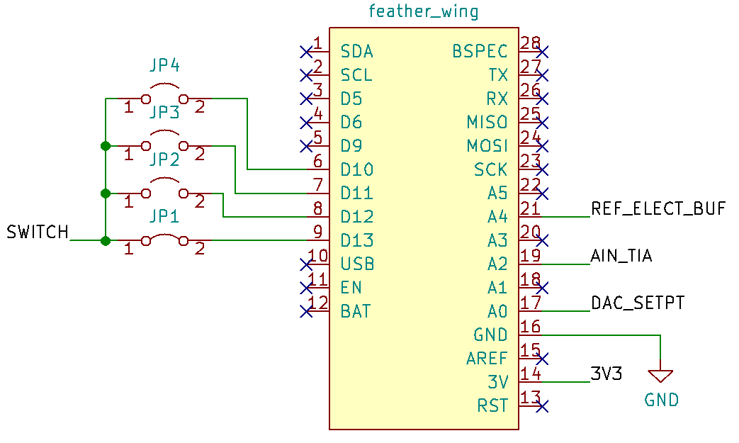 Connected to the Feather's digital output (D13), SWITCH is the input voltage to a digital switch used to connect/disconnect the counter electrode to/from the control amplifier output. When the digital output (D13) is LOW the switch is closed at the counter electroded is connectedto the control amplifier output. Alternatively, when the digital output (D13) is HIGH the switch is open and the counter electrode is disconnected from control amplifier output. The switch can (optionally) be changed to another digital pin using the solder jumpers on the underside of the board. To do this you cut the default trace and bridge the sodler jumper to connect to the desired pin. Other pin options are D12, D11, and D10.