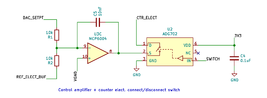 The control amplifier uses a feedback loop to maintain the desired voltage relationship between the working and reference electrodes (the output voltage) during voltammetric tests. It does this by adjusting the potential of the counter electrode. It uses Both the DAC_SETPT and REF_ELECT_BUF signals as inputs. If these two signals are not symmetric with respect to the virtual ground, the control amplifier will adjust potentional of the counter electrode until they are. The schematic for the control amplifier is shown in the image below. Also included in the schematic is the digitally controlled switch which connects/disconnects the counter electrode to the control amplifier output.