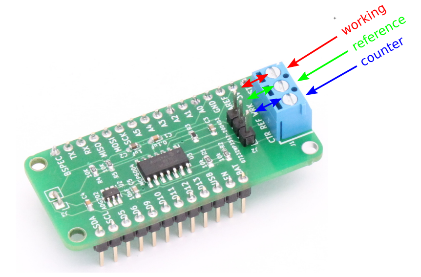 The Rodeostat FeatherWing provides a three position screw terminal and a 3-pin header for connecting the working, reference and counter electrodes. Theses connections are shown in the image below.