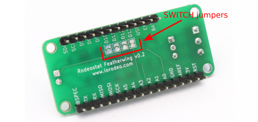 In addition there are four further connections between the Rodeostat FeatherWing and the Feather development board which are used to control the potentiostat and to sample data during trials. These connections (DAC_SETPT, AIN_TIA, REF_ELECT_BUF and SWITCH) are shown in the image below.
