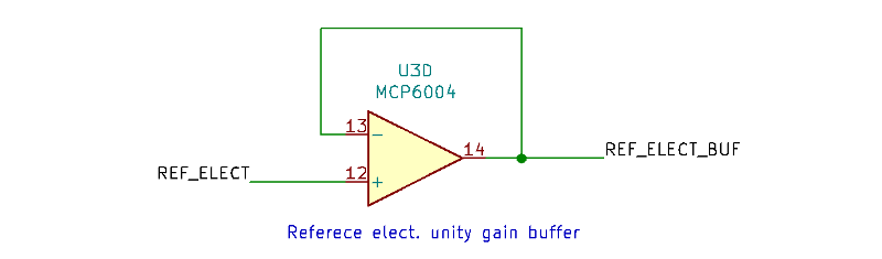 The signal from the working electrode in the test cell, REF_ELECT, is connected to a unity gain buffer amplifier (voltage follower) to produce a buffered version of this sigal, REF_ELECT_BUF. This is done to prevent the subsequent connections in the potentiostat from an effect the REF_ELECT signal. The buffer version of this signal is then sent to the control amplifier where it is used as part of the potentiostats feedback loop. It is also sent to analog input A4 on the Feather development board where it can be sampled. The schematic for the reference electrode buffer amplifier is shown in the image below.