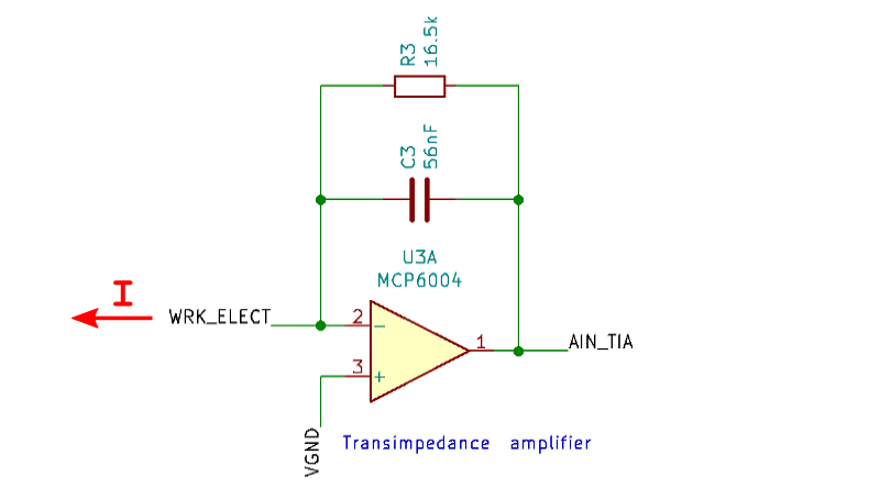 The transimpedance amplifier is a current to voltage converter which is converts the current flowing in/out of the working electrode into a voltage (AIN_TIA) so that it can be measured using used to measure using analog input A2. The output voltage of the transimpedance amplifier is proportional to the current flowng in/out of the working electrode. The schematic for the transimpedance amplifier is shown below.