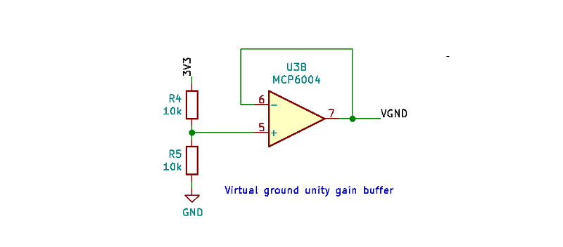 The potentiostat is powered from 3.3V provided by the Feather development board. As many voltammetric tests require bipolar output voltages, the potentiostat uses a virtual ground VGND at 1.65V for the test cell. This value is convenient as it is halfway between the 3.3V power input and the feather's ground. The virtual ground, VGND, is created using voltage-divider made from two 10k (0.1% tolerance) resistors and a unity gain buffer amplifier as shown below.